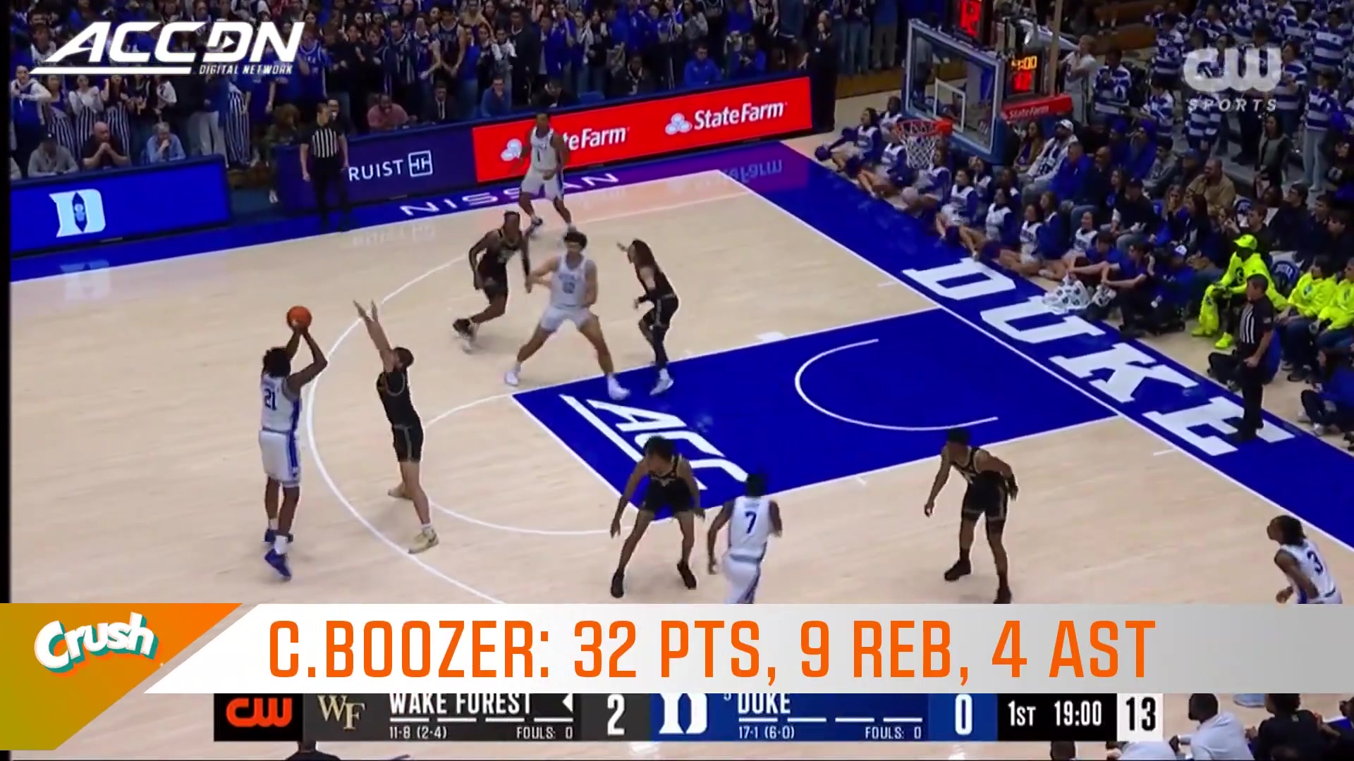 01月25日讯 NCAA常规赛,杜克大学在主场以90-69大胜维克森林大学,豪取7连胜。开季至今,蓝魔杜克的战绩是18胜1负。此役,状元热门、杜克大学明星前锋卡梅隆·布泽尔发挥上佳,他登场32分43秒20投11中,三分8中3、罚球7中7,砍下32分9篮板4助攻3抢断,仅1失误,正负值+24。...